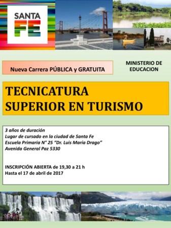 Se inicia en la ciudad de Santa Fe el dictado de la Tecnicatura Superior en Turismo. La misma se dictará en las instalaciones de la Escuela No. 25, Luis María Drago, ubicada en General Paz 5330. La inscripción está abierta hasta el 17 de Abril, en el horario de 19.30 a 21 hs.