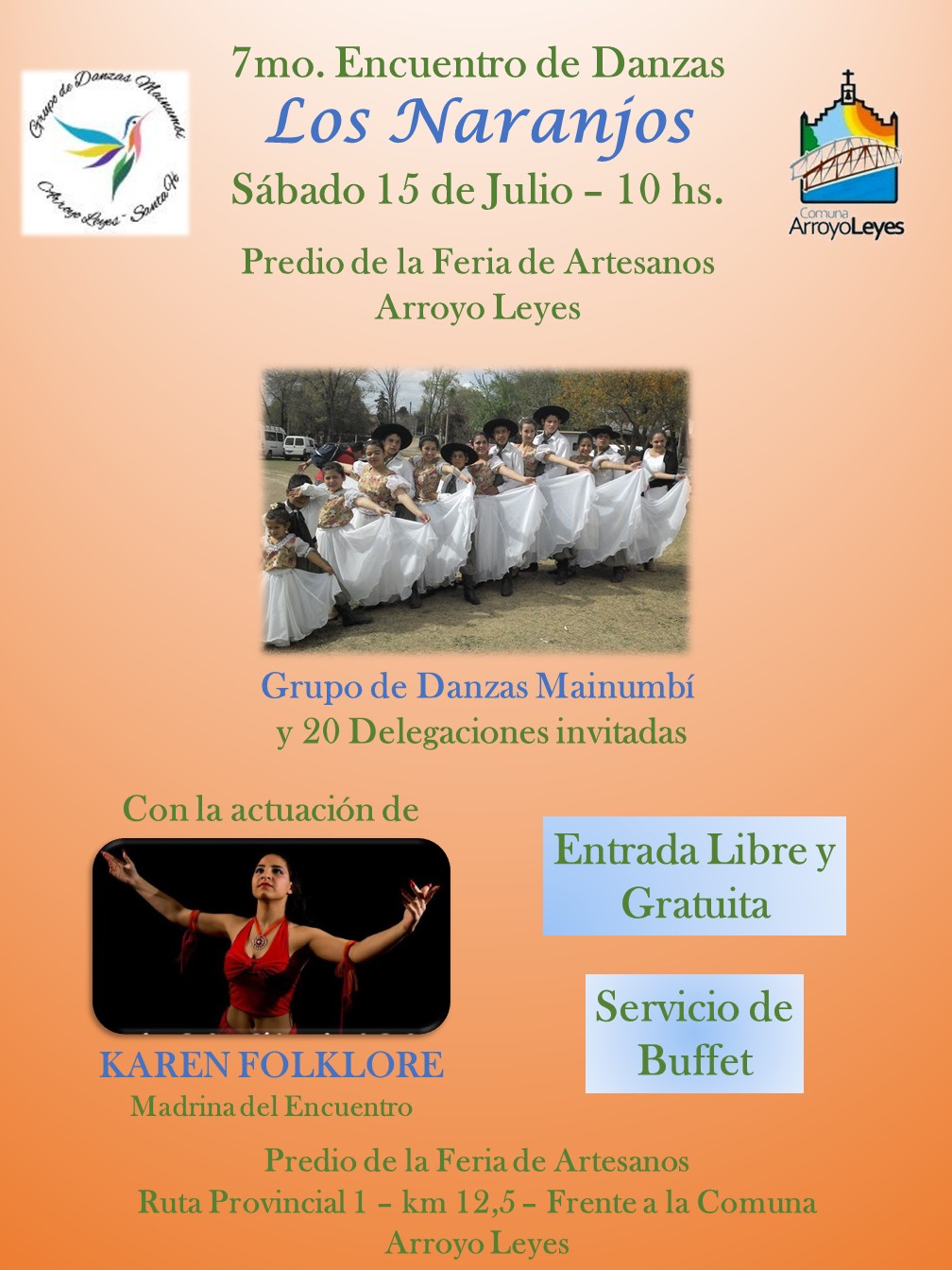 Se ha convertido en un clásico de las vacaciones de invierno. Y este 2017 no será la excepción. Porque este sábado 15 de Julio se desarrollará el Séptimo Encuentro de Danzas Los Naranjos, organizado por el Grupo de Danzas Mainumbí, a cargo de la profesora Belén Mendoza. Será en el predio de la Feria de Artesanos de Arroyo Leyes, ubicado en Ruta Provincial 1 – km 12,5 – Frente a la Comuna de Arroyo Leyes, a partir de las 10 hs.